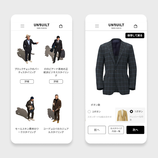 オンラインでのスーツのカスタムオーダーサービスUNBUILT TAKEO KIKUCHIのシステム開発部分を担っています。サイズや形状、色などをユーザーが3DCGのシミュレーターを使って自由にカスタムできます。