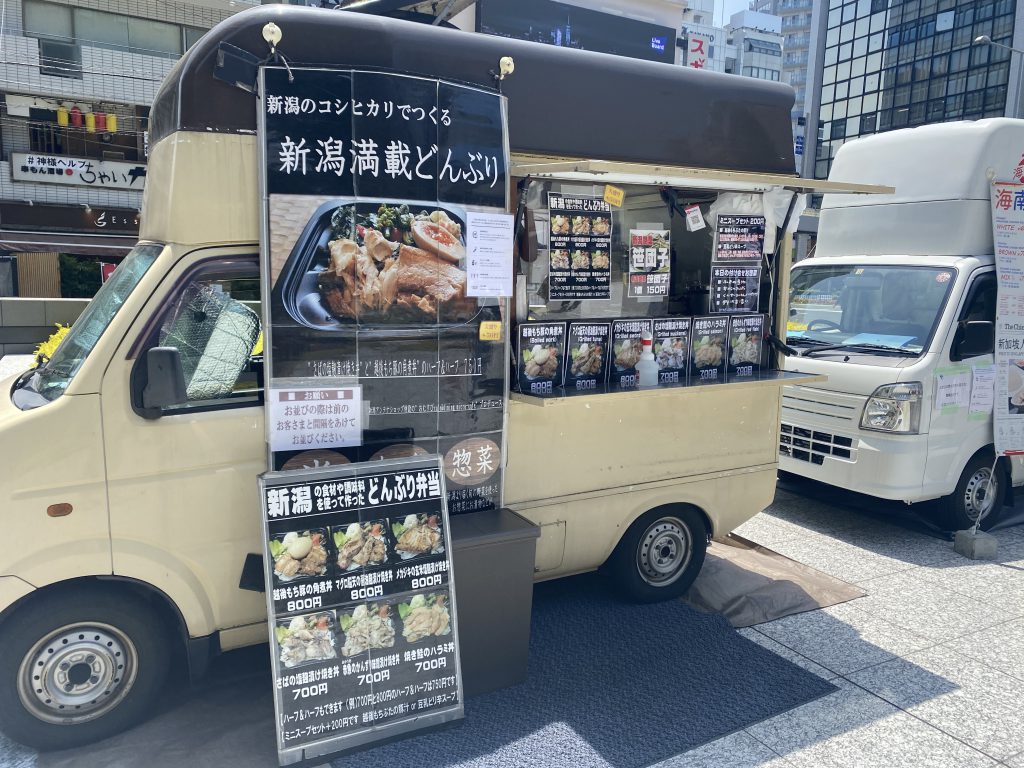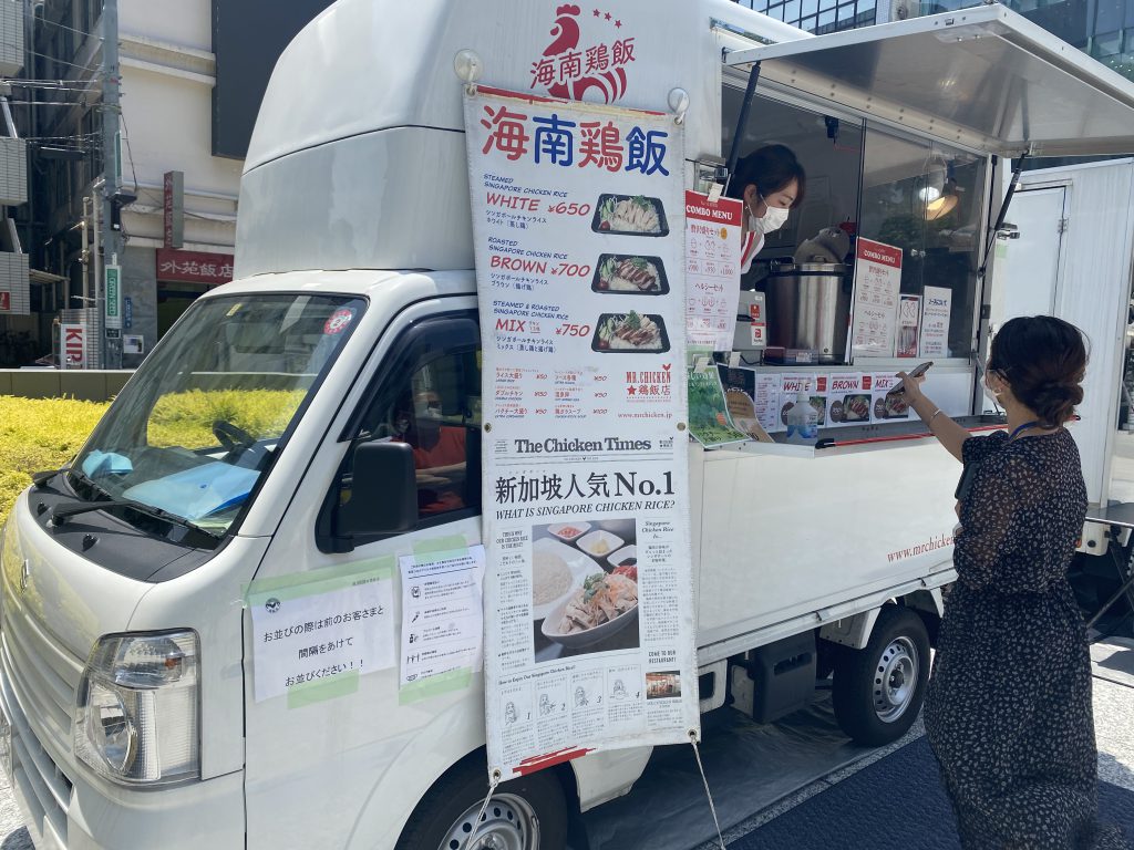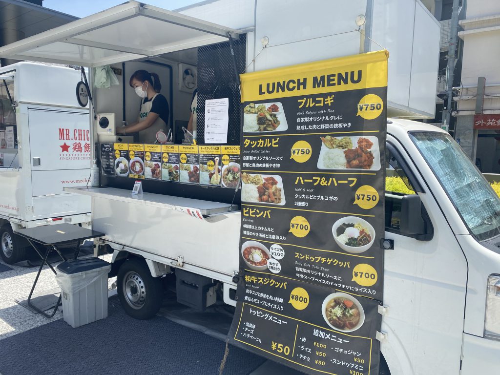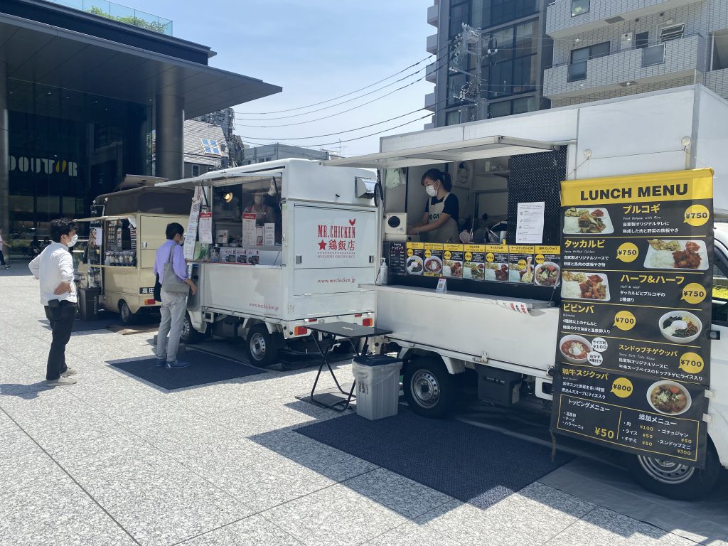 北青山ビルから外苑前方面の横断歩道を渡ったところにあるavex本社前のランチカー。タイ料理、韓国料理、海南鶏飯、丼ぶり、肉丼など日替わりで3店舗が並びます。