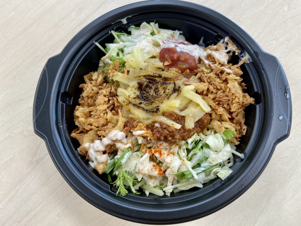 濃厚なタコミートに香ばしい炙りチーズ、シャキシャキのキャベツや水菜、サクサク食感のフライドオニオンと具材がたっぷりで満足感があります。辛さは無料で調整可、ワカモレや温玉トッピング、大盛など自分好みにカスタマイズできるので絶えず男女のお客様がテイクアウトしていきました。