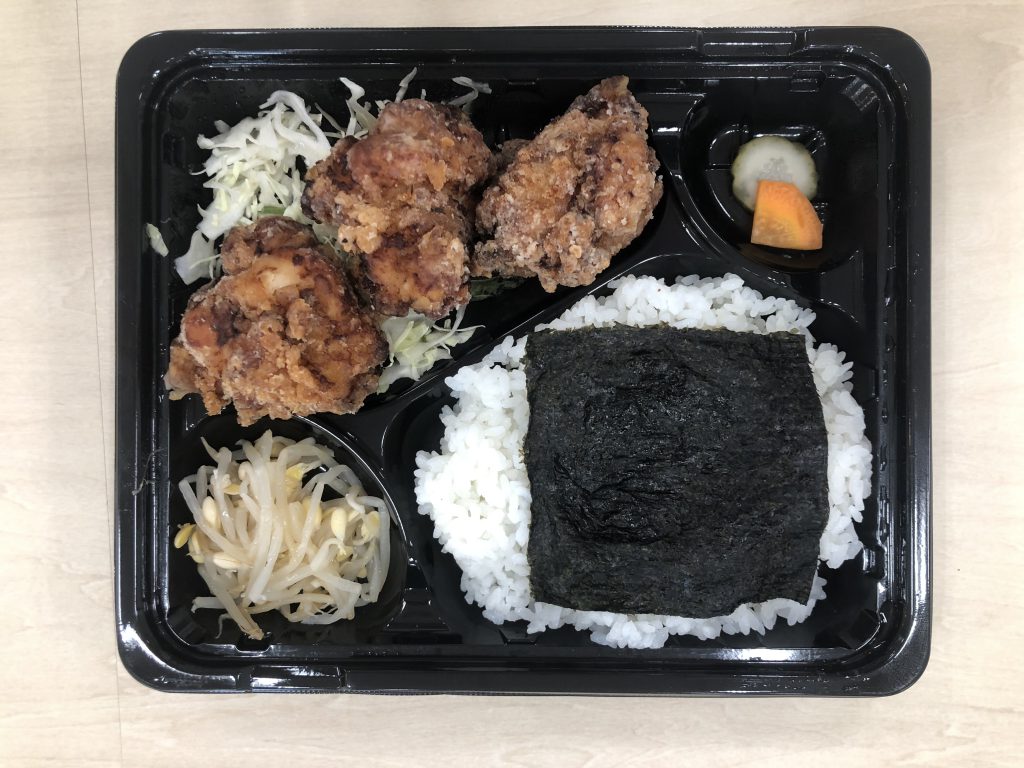 カリっと揚がった唐揚げは食欲をそそる、風味豊かな衣が特徴。海苔弁はたっぷりの明太入りで大満足のボリュームです。