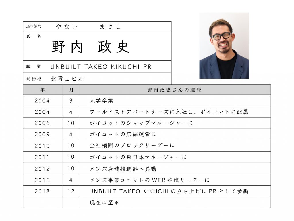 「江口さん(現UNBUILT TAKEO KIKUCHI屋号長)に “UNBUILT TAKEO KIKUCHIという新しいブランドを立ち上げるから協力してほしい”と誘っていただきました。自分の成長につながるのではと思い快諾し、PR(プレス)を担当することになりました。SP(セールスプロモーション)的な部分にも携わり、今はUNBUILT TAKEO KIKUCHIをどのような方法で外へ発信するかということを常に考え、具現化しています。新しい事業に携われているっていうのは、本当にラッキーだったと思いますね」