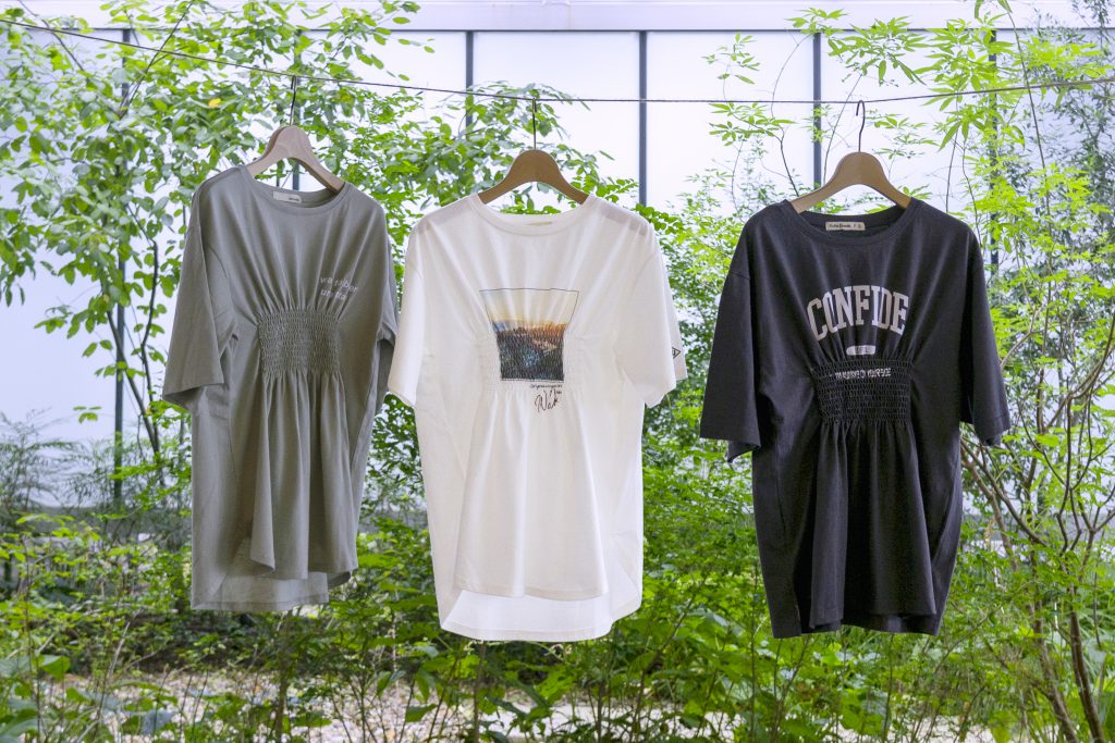 なお、今回トピックスとしてワールドで余剰在庫となったTシャツに、アップサイクルブランドの「スリュー」がシャーリング刺繍を施した商品を販売します。前面にシャーリング加工を施すだけで、シルエットと共に新しい表情を見せる1点物のTシャツに生まれ変わった数量限定企画です。