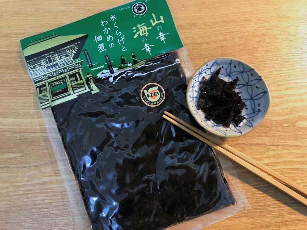 最近のごはんのお供でお気に入り商品は、熊本県のお醤油屋さんが作る「海の幸山の幸」という名前の、木くらげとわかめの佃煮です。