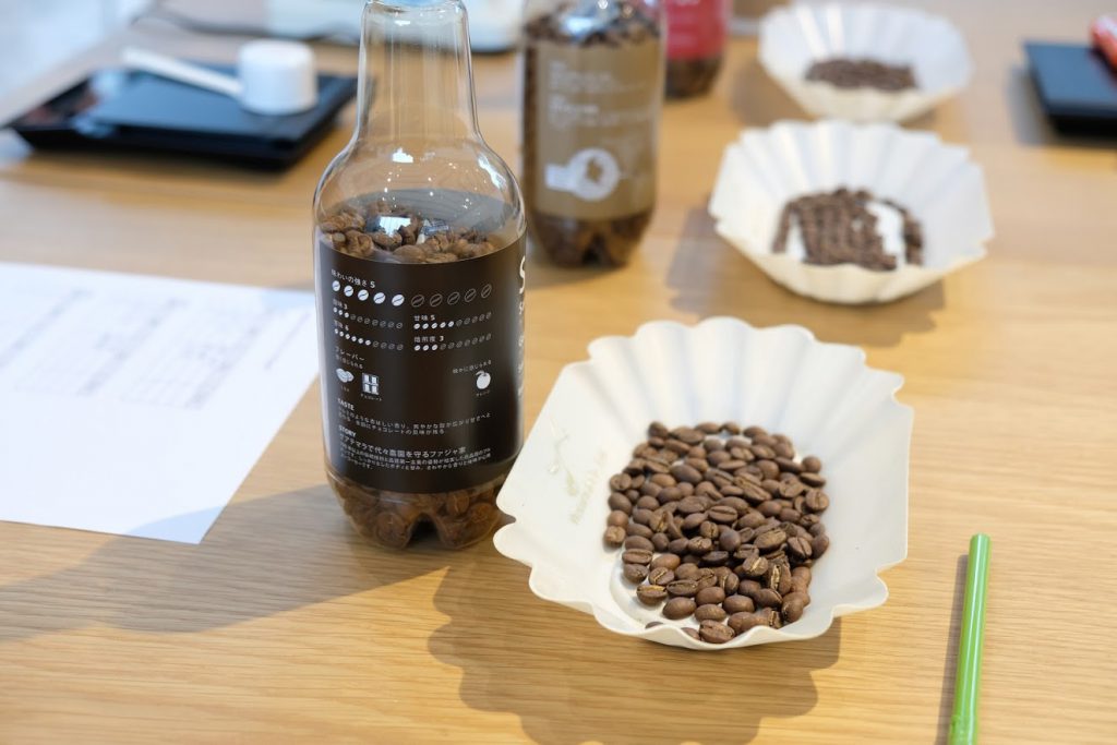 左)サステナブルなコーヒーワークショップ。オリジナルブレンド作りと美味しいコーヒーの淹れ方を体験しました。