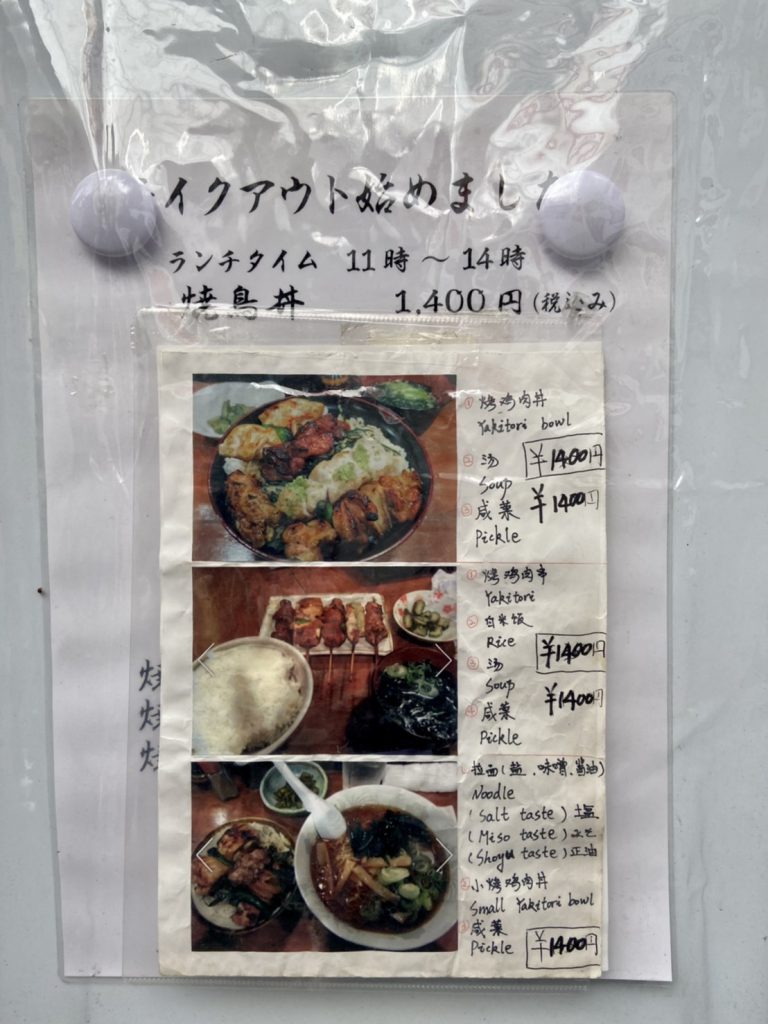 ここで注意していただきたいのが、店内にメニュー表記が無い事。席に着くとすぐに店員さんが「丼ぶり・定食・ラーメンセット?(焼き鳥丼、焼き鳥定食、ラーメンセット)」と注文を取りに来てくれるので、入店前に看板の足元にあるメニューをチェックしておきましょう!