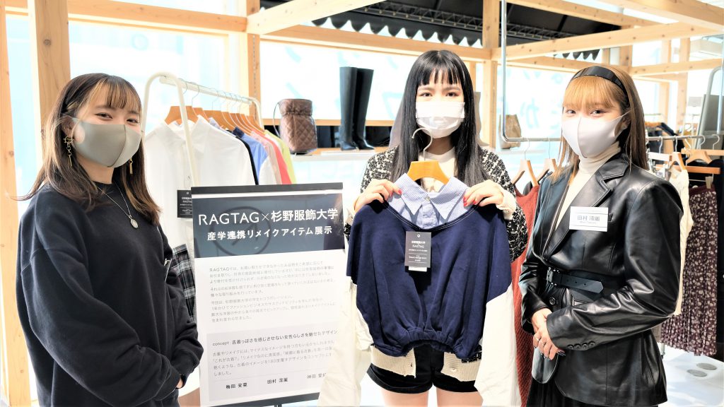 リメイク実習は、コンセプト・テーマ選定に次いでデザイン画を出してもらう所から始まり、その後学生たちと一緒に国立の「ラグタグ」の倉庫で素材選びを行いました。その後、ワールド北青山ビルでデザインに対して使う素材選びや、地下の“クリエーターズラボ”で縫製を行い仕上げていきました。シャツやカットソーのドッキング、またパンツの裾など異なるパーツの組み合わせからなるデザインは、きれいにおさめるだけでなく、シルエットやバランスを見ながらの縫製で学生にとっては困難でしたが、実際に店頭に並べて販売している笑顔の学生たちを見ると手掛けて良かったと思いますし、学生も何かを得てくれたと感じています。今後は、杉野服飾大学と同系列のドレスメーカー学院からインターンシップの受け入れも行い、自分の技術を少しでも活かした継続できる取組みとして一緒に創り上げて行ければと思います。