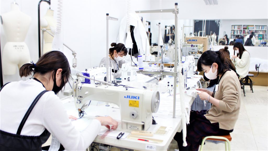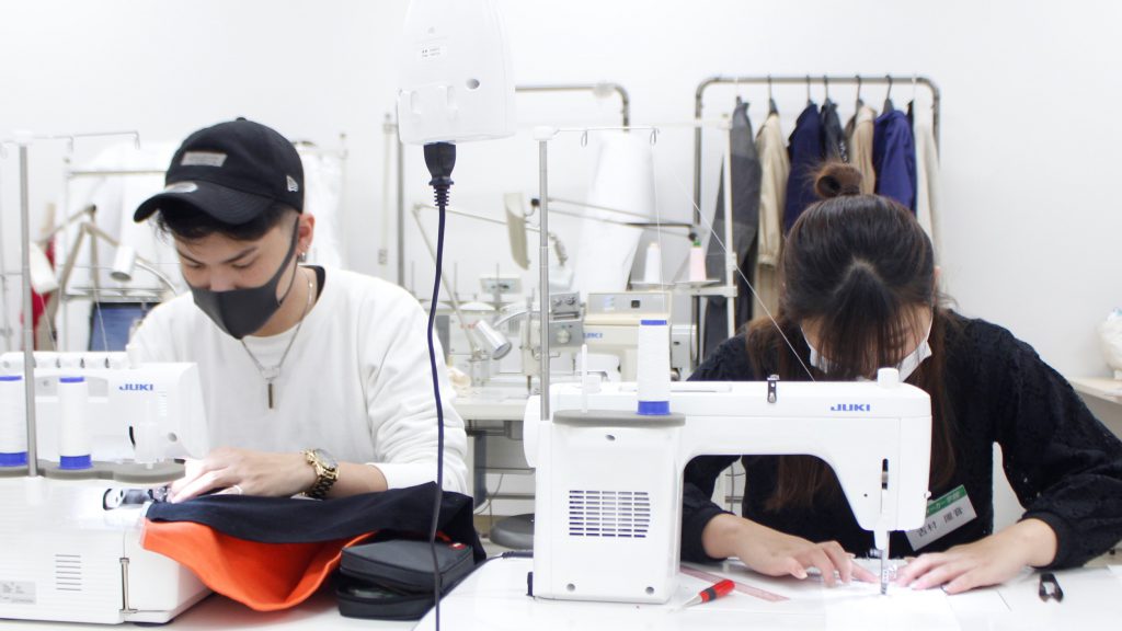 左)学校での授業の様子 右)“クリエーターズラボ”で縫製をする杉野の学生たち