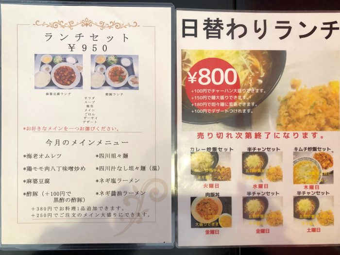 メニューには、ランチセットと日替わりランチの案内が。ランチセットのラインナップが豊富でしばし迷いましたが、チリケンの人気メニューである麻婆豆腐を注文することにしました。勿論大盛(+250円)です。店内に充満する香ばしい匂いと、厨房から聞こえてくる中華鍋の音色を楽しみながら、待つこと数分。ついに麻婆豆腐とご対面です。