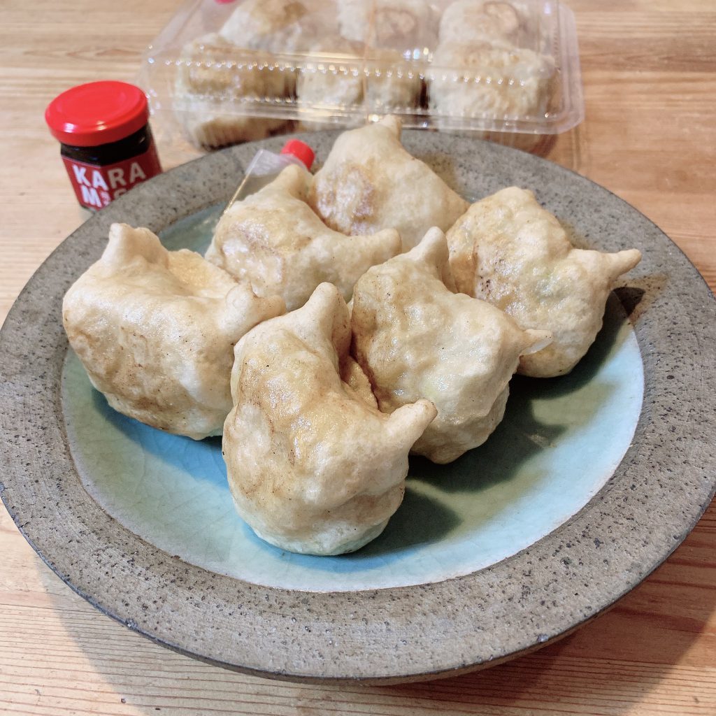 餃子ではなく、”ぎょうさん”。大ぶりで分厚い皮に、ぎゅうぎゅうに具が詰められているのが特徴です。