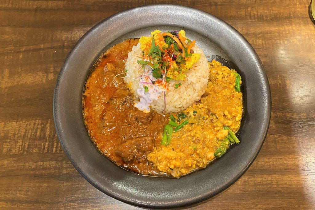 神田川を離れ、住宅街をずんずん進んでいくと、ゴールであるカレー屋さん「kitchen and CURRY」に到着しました。ランチでは週2日しかオープンしていないこのお店は大人気で、この日もランチタイム終了間際にも関わらず満席でした。少しだけお店の外で待機です。お店のある通りには木が覆いかぶさるように生えていて、木漏れ日が気持ちいいです。「今日は天候に恵まれてよかったな~」なんて考えていると待ち時間もあっという間でした。食べられるカレーは日替わりで、私はこの日のメニューから「黒酢のポークビンダル」と「オータムポエムとチキンのキーマ」のあいがけをチョイス。オータムポエムはアスパラ菜を指すらしく、それが甘口のカレーにサクサクとした食感を生み、口の中が楽しかったです。ライスにはヨーグルトがかけられており、ほのかな酸味がスパイシーな「黒酢のポークビンダル」とマッチしてこれもまた絶品。本当に美味しかったです…ごちそうさまでした。