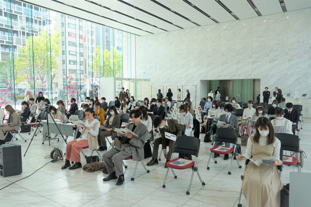 開場したのは入社式が始まる1時間前。徐々に集まりだす新たなメンバーの表情は言わずもがな緊張した面持ち…。この日のために制作された社内報「MOVING」のタブロイド判を読み、式が始まるのを待ちます。