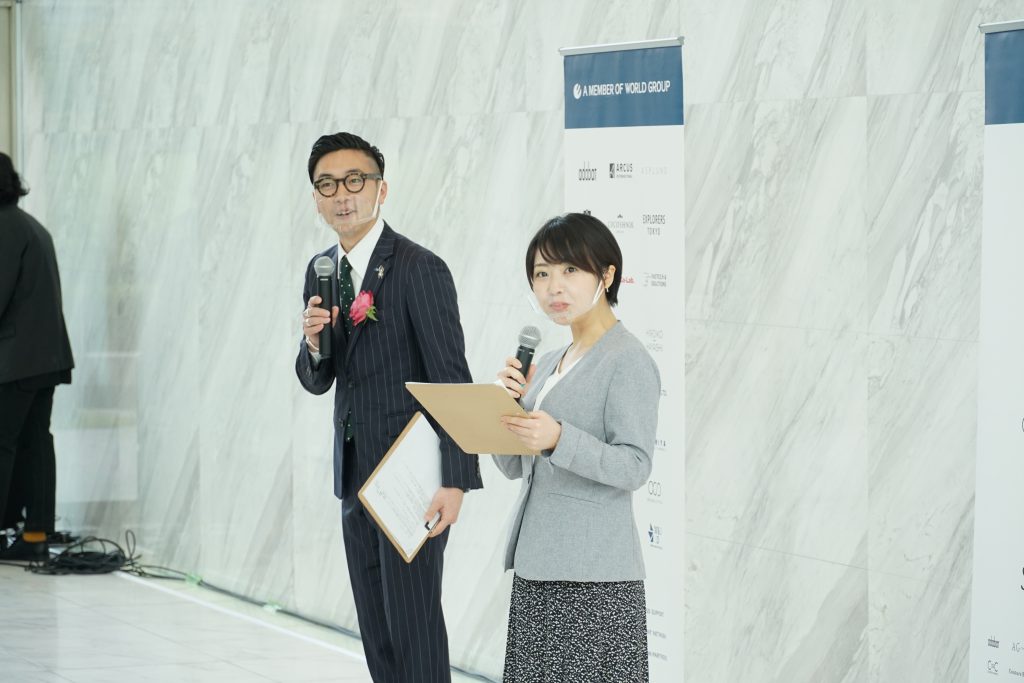 先輩社員による楽しい余興の甲斐もあり、新入社員の緊張もほぐれました。そして、いよいよ入社式のスタートです。司会進行は、株式会社アルカスインターナショナルの久保田 大輝さんと株式会社ワールド グループ人事統括室の青木 柚衣さんのお二人が担当。