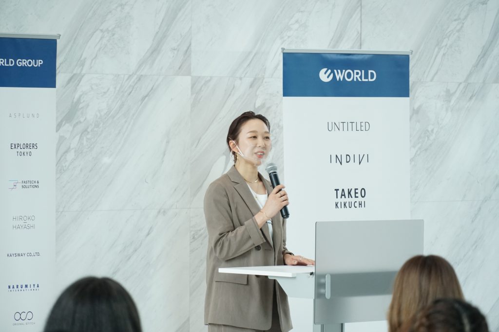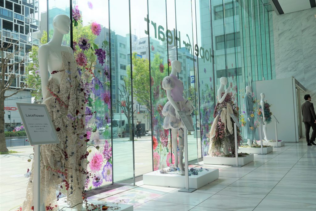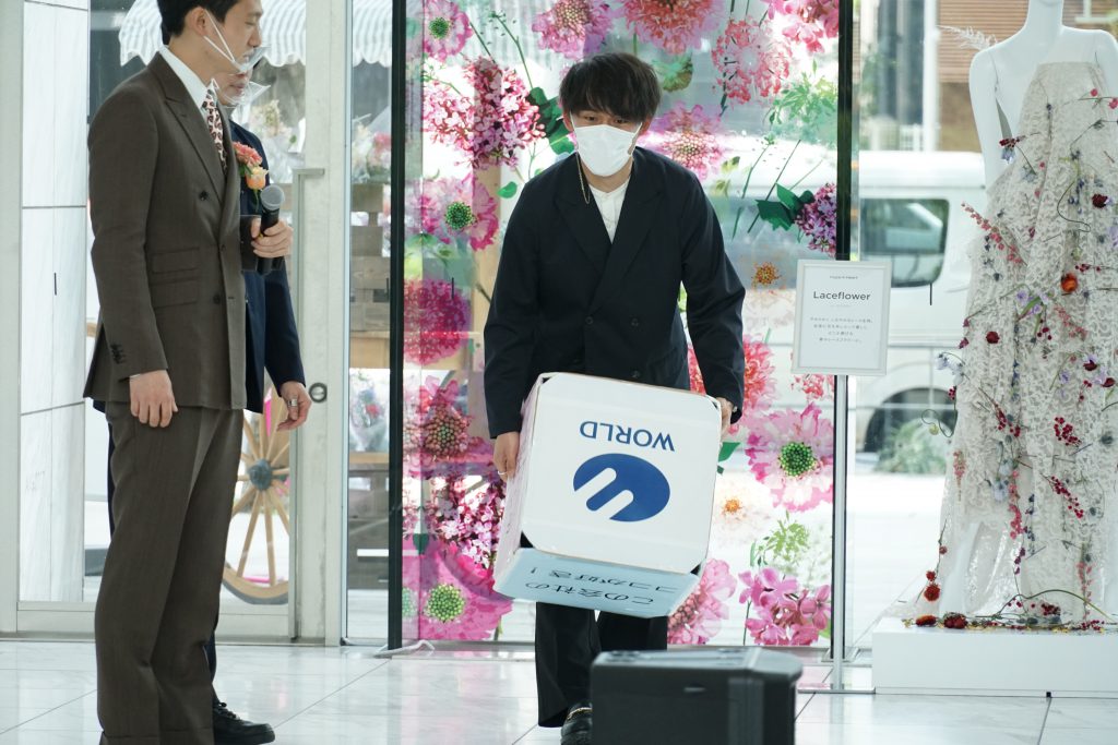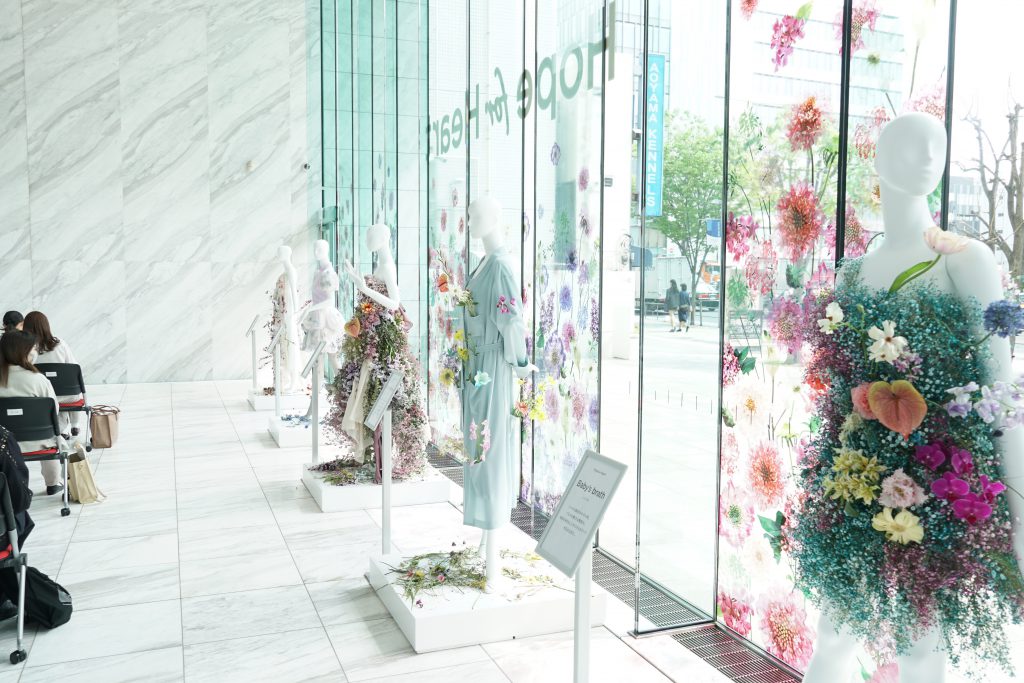 同日まで開催されていた「Hope for Heart」は、ロスフラワー(売れ残ったお花)と、ワールドグループの余剰となった服地によって、世界に一つしかない花のドレスを制作したイベント。この企画を監修したフラワーデザインチームguiの前田 有紀さんにも入社式にご参加していただき、新入社員へ祝辞を贈ってくださいました。