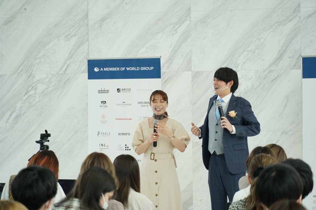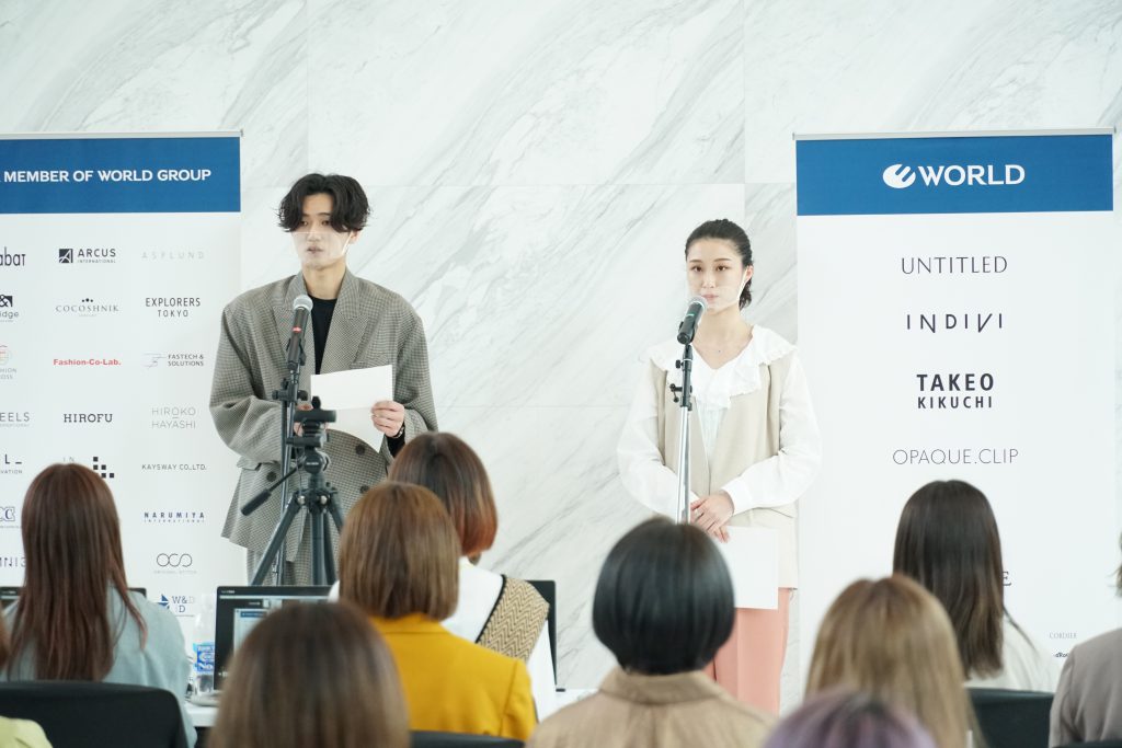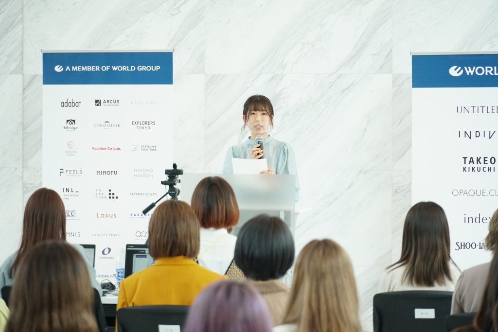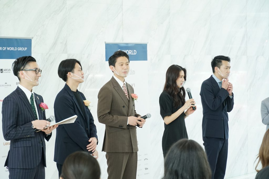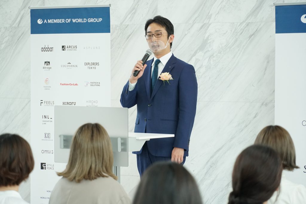 同日まで開催されていた「Hope for Heart」は、ロスフラワー(売れ残ったお花)と、ワールドグループの余剰となった服地によって、世界に一つしかない花のドレスを制作したイベント。この企画を監修したフラワーデザインチームguiの前田 有紀さんにも入社式にご参加していただき、新入社員へ祝辞を贈ってくださいました。