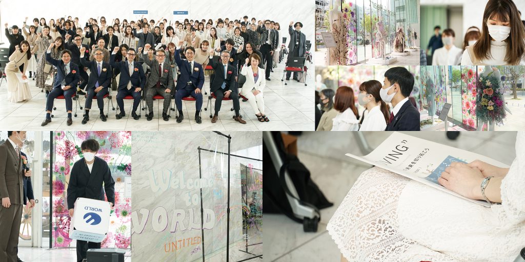 2021年4月1日、ワールドグループの入社式が、午前と午後、そして全国の拠点をオンラインでつないで行われました。社会人としてスタートを切った新入社員のみなさんを祝うべく、先輩社員の余興や社内報タブロイド判の配布、さらには、販売で売れ残ったお花(ロスフラワー)を中心にした草花と、ワールドグループで余剰となった服地でつくられた花ドレスの展示など、今までにない手作り感溢れる式典となりました。今回はそんな入社式の模様をお伝えします。