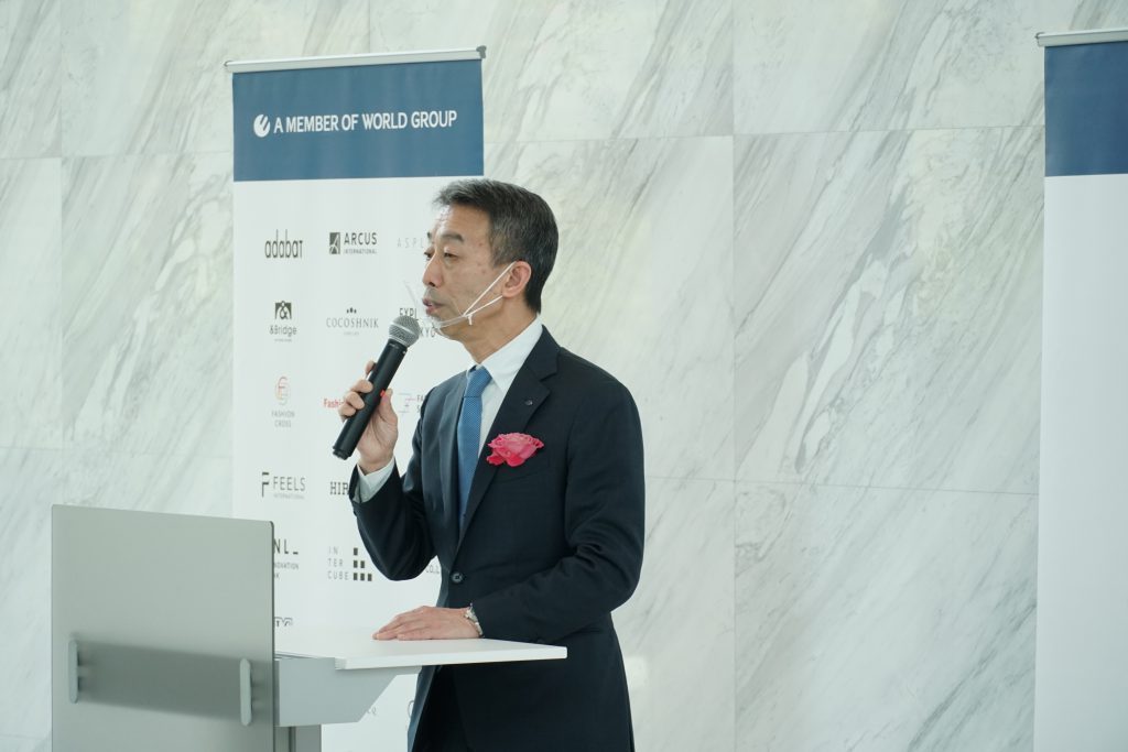 入社式に参加した社長および役員の紹介が行われた後、ワールドグループを代表し、株式会社ワールドの鈴木 信輝社長と株式会社ワールドストアパートナーズの谷村 耕一社長からの祝辞がありました。鈴木社長からは『苦手なことにチャレンジしてほしい』、谷村社長からは『なるほど人間』になってほしいというメッセージが新入社員へ贈られました。
