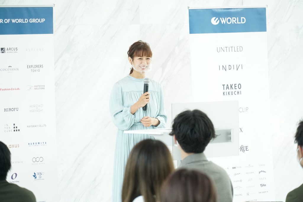 同日まで開催されていた「Hope for Heart」は、ロスフラワー(売れ残ったお花)と、ワールドグループの余剰となった服地によって、世界に一つしかない花のドレスを制作したイベント。この企画を監修したフラワーデザインチームguiの前田 有紀さんにも入社式にご参加していただき、新入社員へ祝辞を贈ってくださいました。