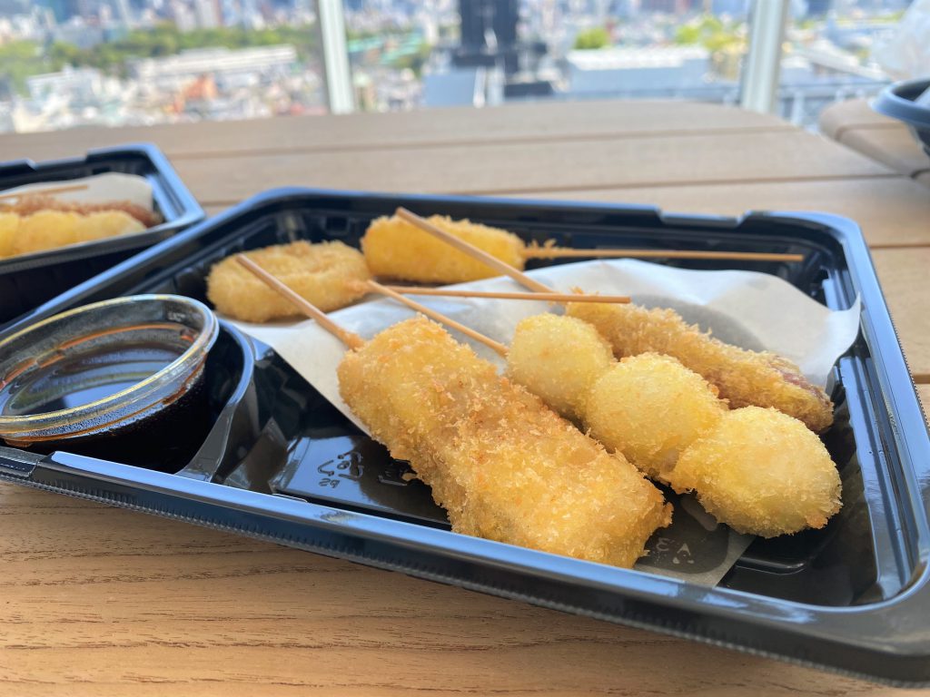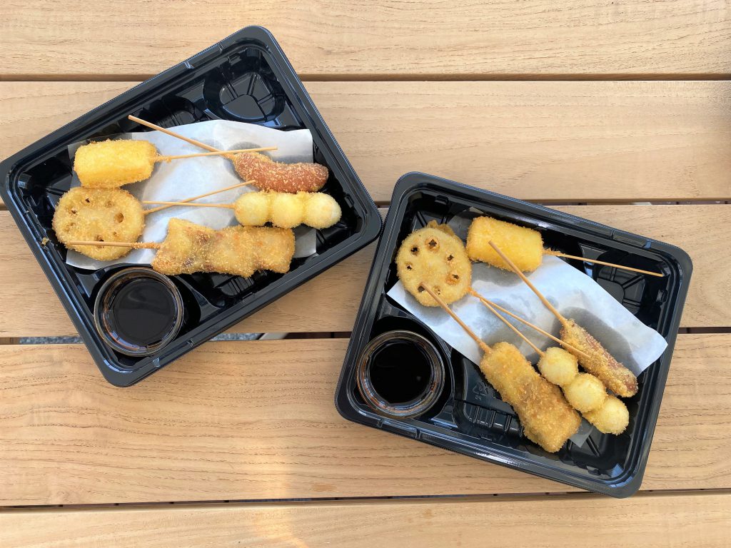五十川さんが注文した串カツも勿論揚げたて!5種盛りの中身は、豚バラ/蓮根/チーズ/ウインナー/うずらでした。串カツが大好物という五十川さん。本来ならば二度付け禁止の串カツソースを、「テイクアウトだから!」と贅沢に二度付け三度付け!「シャキシャキのレンコンと、爆発が怖くて家では揚げられないうずらの卵がお気に入り」と語る表情は幸せそう。久しぶりに食べる大好物の味にご満悦みたいです。