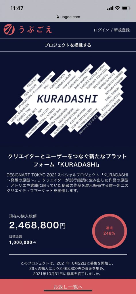 こちらの会場では、クラウドファンディングサービス「うぶごえ」と共に、市場に出回っていないクリエイターの秘蔵の作品を購入できるイベント「KURADASHI~発想の原型~」を開催しました。デザイナーの倉本 仁氏がキュレーションを担当し、国内外の若手から著名デザイナーまで多くのクリエイターが参加。彼らが試行錯誤を経て生み出した作品の原型や、様々な理由でアトリエや倉庫に眠り、市場に届くことのなかった秘蔵の作品を展示販売しました。