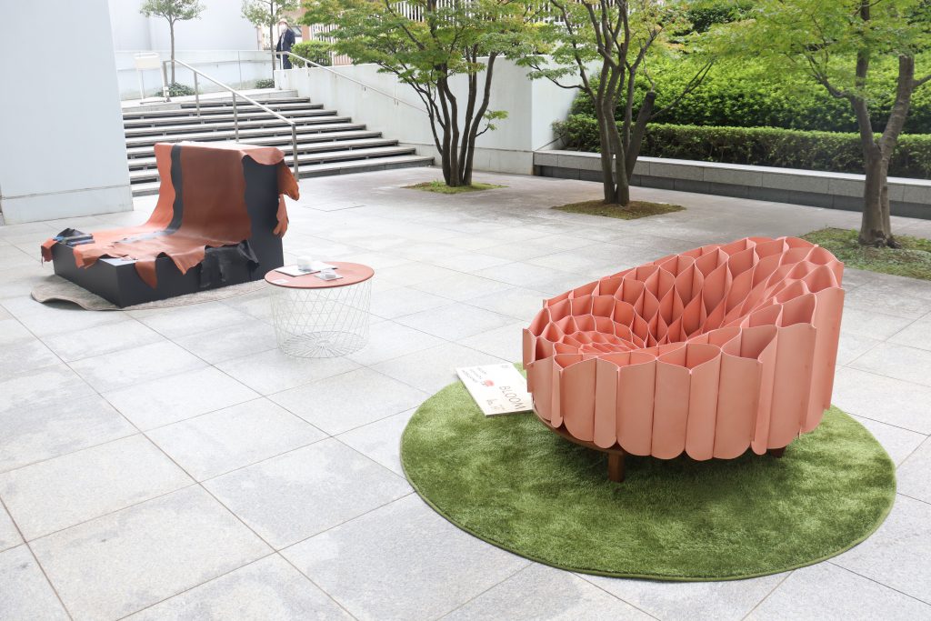 屋外展示は、神戸レザーを贅沢に使用したチェア。まるで花が咲いたようなデザインが目を引く「BLOOM by ジョニー・チウ×神戸レザー」 (画像手前)は屋外・アウトドアでの使用も想定したガーデンチェアで、オブジェのような美しさでありながら折り畳んで旅客機や船舶、車で持ち運ぶことも可能な仕様です。実際に座り心地を試される来場者も。こんなおしゃれなチェアが似合うテラスがある素敵な家に住みたいものです。