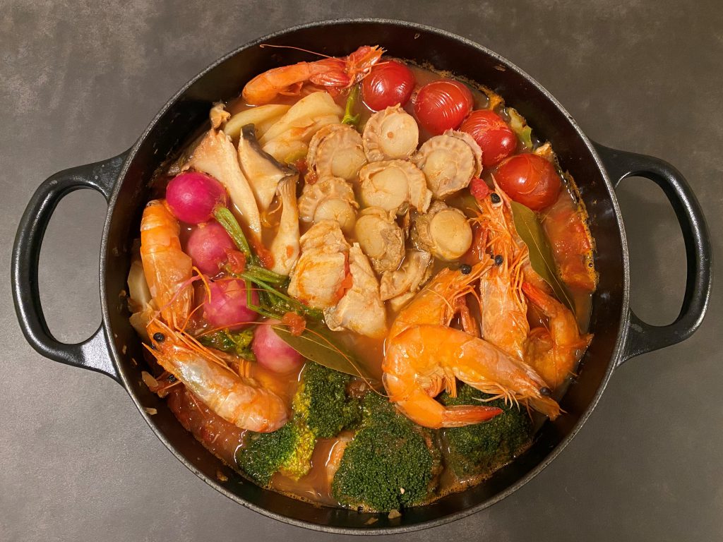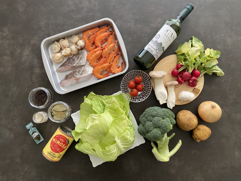 有頭海老10匹/鱈2切れ/ホタテ1パック/ブロッコリー1/2株/じゃがいも2個/玉ねぎ1/2個/キャベツ8枚/ラディッシュ4個/エリンギ2個/ミニトマト4個/にんにく2かけ/エキストラバージンオリーブオイル大さじ1/白ワイン1カップ/★カットトマト缶1缶/★水 トマト缶1缶分/★ローリエ2枚/★コンソメキューブ1個/★塩 少々/★ブラックペッパー 少々