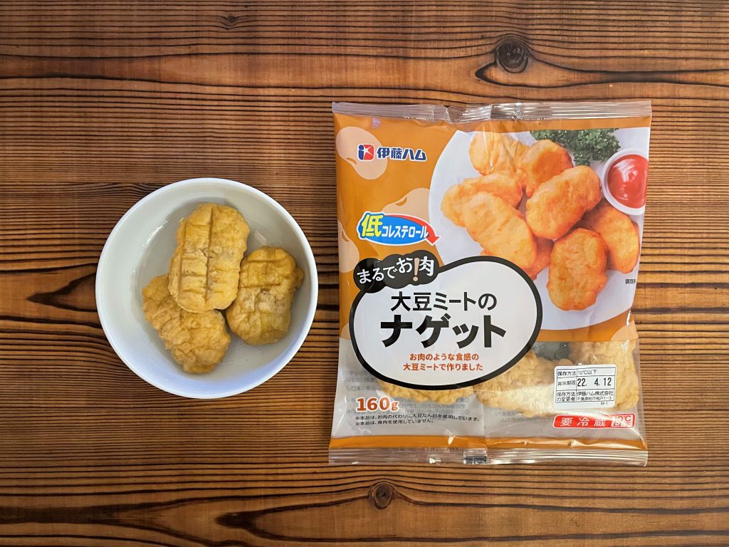 西友で見つけた、代替肉を用いたチキンナゲット。食感が柔らかいのが少し気になるものの、味は本物のチキンナゲットそのもの。ケチャップの味で誤魔化されてるだけかも?と思いそのまま食べてみたのですが、やはり大豆からできているとは感じさせない味でした。名前の通り『まるでお肉』な代替肉商品でした。