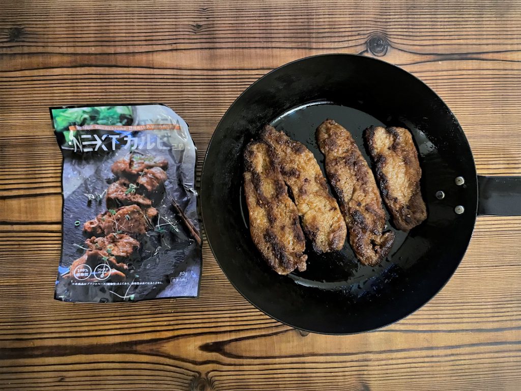 パッケージ裏面に書かれていた食べ方のとおり、フライパンに油を敷き、NEXTカルビを焼き目がつくまでしっかりと焼きます。見た目は本物のカルビと遜色ないですが、味の方は果たして…。焼き肉のたれをつけて口に運んでみると、牛肉と比べて油が少ないので、滑らかさと食べ応えは少し劣るものの、かなり美味しい!何も知らされずに食べたら、大豆から作られた食品だと気づくのは難しいと思います。正直食べる前は、ぼそぼそとしていたり、咀嚼していると大豆の味がしたり、あまり美味しくないのでは?と疑っていましたが、いい意味で裏切られました。肉ではないけど、かなり肉に近いです。個人的には、もし一生肉が食べられなくなったとしても、これがあればギリギリ耐えられるのでは、と思わせてくれるようなクオリティでした。