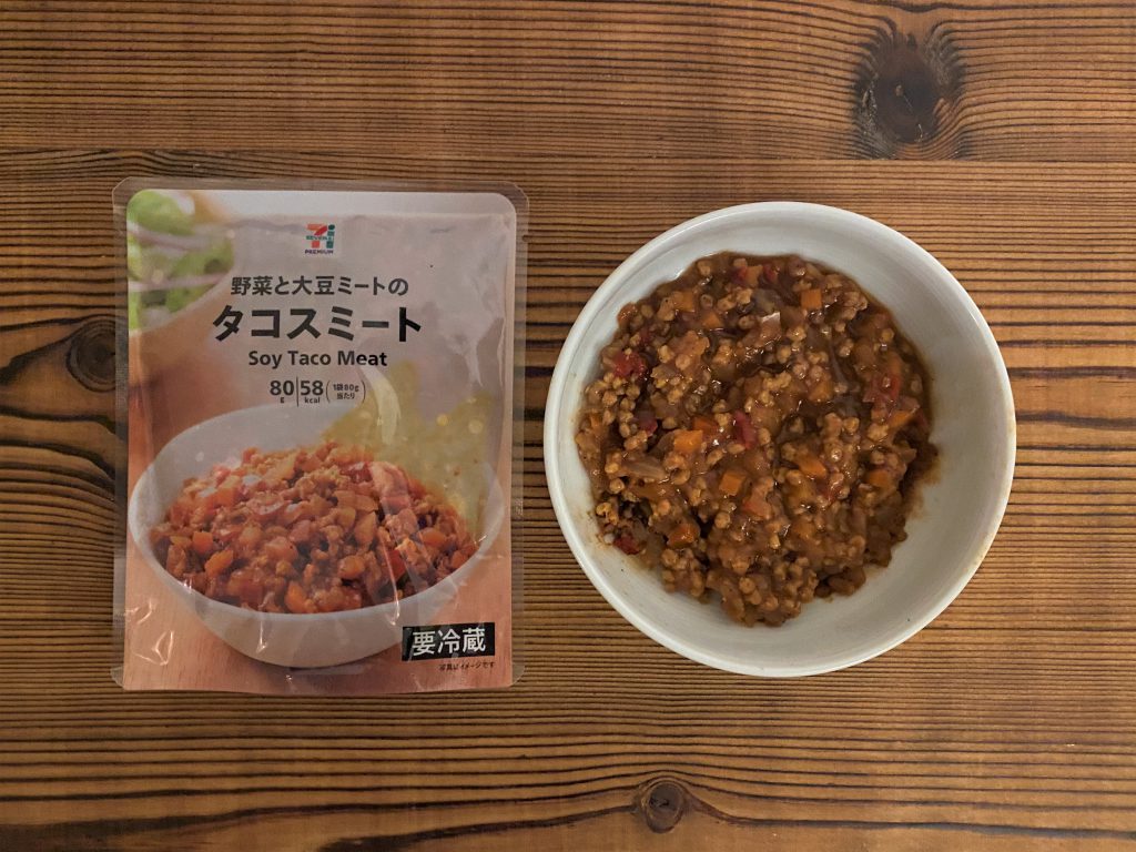 こちらはセブンイレブンで購入した、代替肉を用いたタコスミート。味付けがピリ辛で美味しいのはもちろん、代替肉がミンチにされていることもあり、本物の肉と違いが全く分かりませんでした。ご飯のおかずにも、お酒のおつまみにもできる味で、冷蔵庫に常備しておいてもよさそうです。