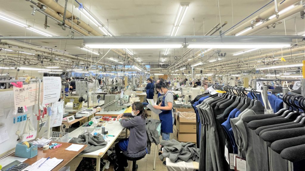 中途入社し、今年1月で3年目になりました。元々手で作業するのは好きでしたが趣味程度でしたし、以前はネット通販の会社に居たので全く違う業務になります。現在行っていることはラインのサポーターとして主に前身頃、後身頃などの縫製を見ています。1日の目標に着数が届くよう進捗を合わせます。