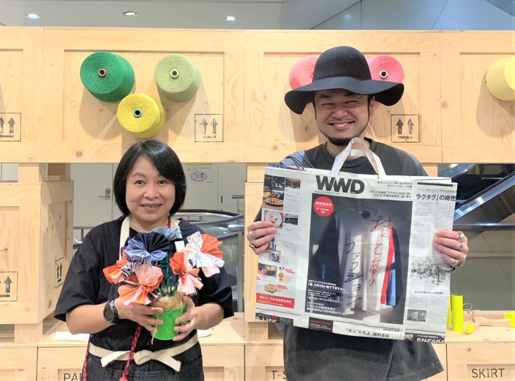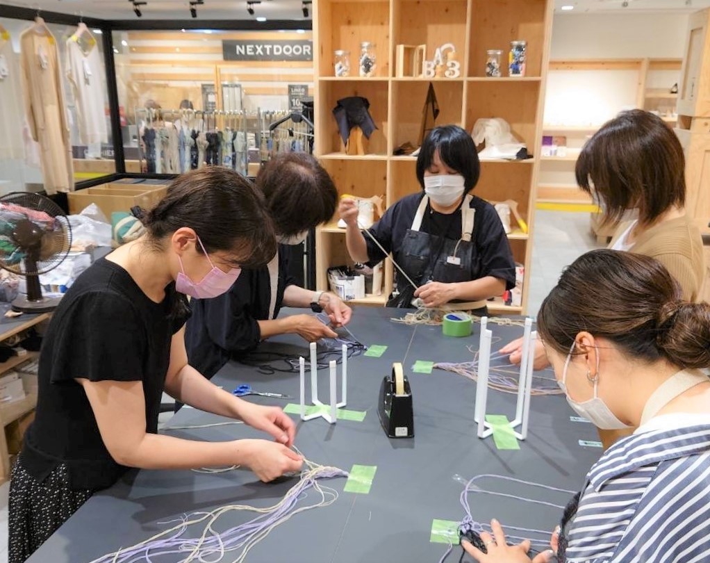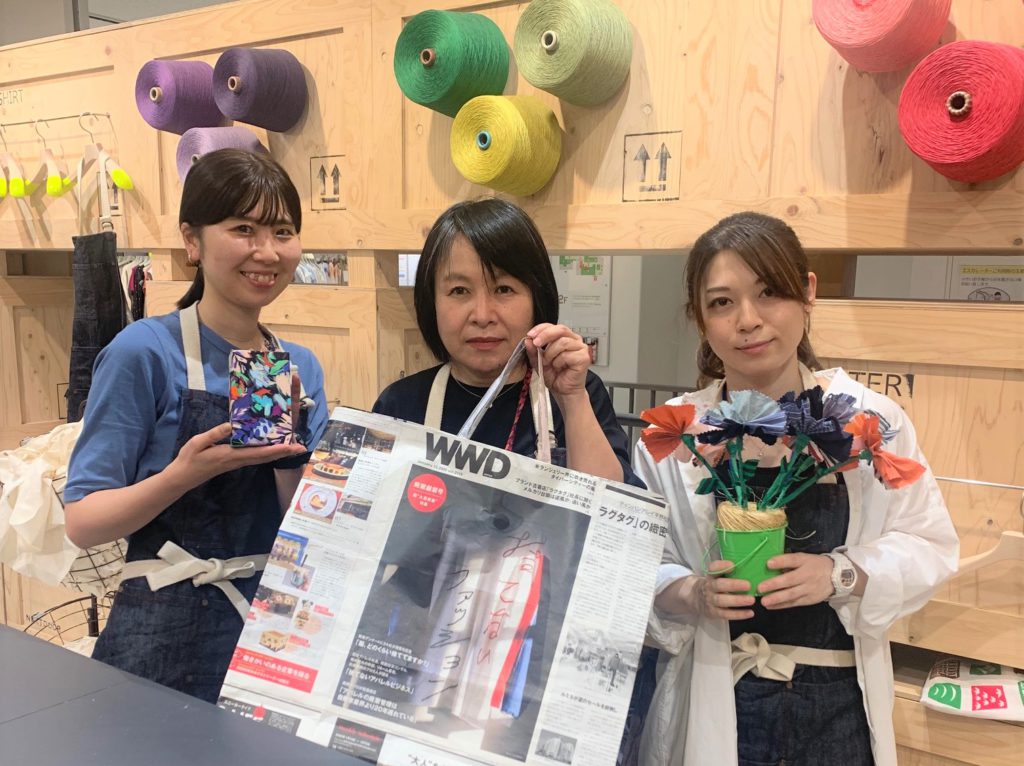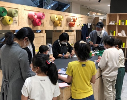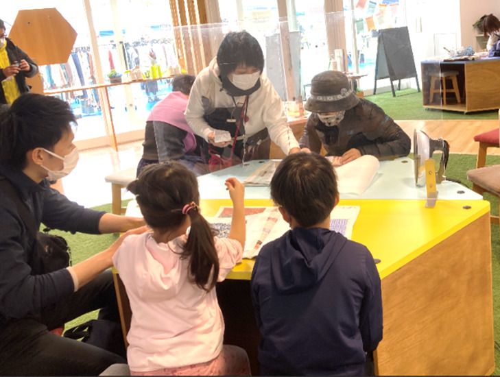 20年7月にオープンした「ネクストドア」キテミテマツドに広がるスペースを見て「ここで、お客様と笑顔でコミュニケーションができるワークショップを行いたい」と考えました。アフターコロナを見据え、SDGsの取り組みにつなげるために、自社工場の残反や裁断をした際のハギレ、社内の古紙を再利用したワークショップを行いたいと考えました。年齢を問わず3歳から70歳までどの年代でも飽きがこない、30分から40分の手作業で出来るプログラムを考えていきました。お客様がお帰りになる時に、笑顔で「楽しかった」「また来るね」と仰っていただけるようになり、1回ごとにノウハウも蓄積していきました。理念を伝える「ReBorn」をキャッチコピーに、まずはファンを増やしそして横展開できる活動につなげたいと考えています。