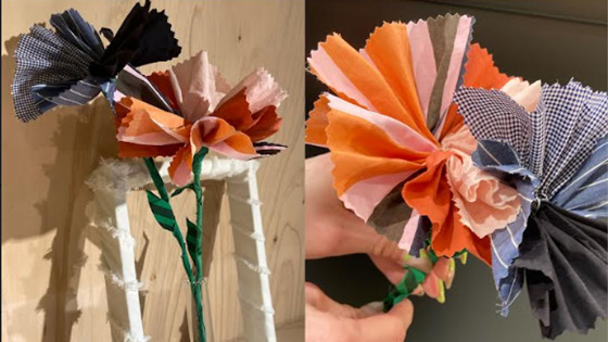 WP2リメイクプロジェクトで出た古着を利用したカーネーション。様々な風合いが魅力