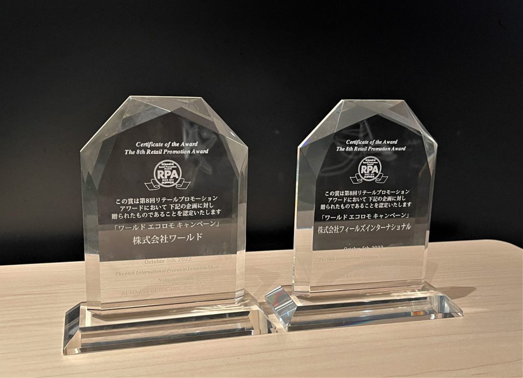 ワールドとフィールズインターナショナルは「ワールド エコロモ キャンペーン」において、ビジネスガイド社主催の「第8回リテールプロモーションアワード」を受賞しました。今回は受賞式の様子をレポートします。