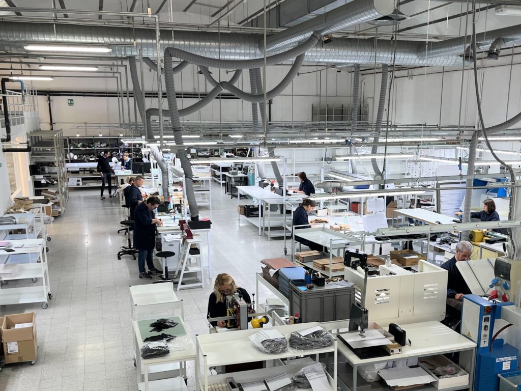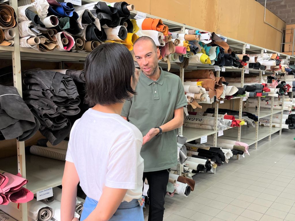 9月にイタリアの展示会におよそ10日間行ってきました。コロナ禍を経ておよそ3年ぶりで、革をつくる工場にも行き、なめしや色付けの工程から「HIROFU」の革のオリジナルの部分も再認識できました。「HIROFU」の色付けは2トーンで、見た目は1色でものっぺりしないように、艶感を出してリッチに見せるように仕上げています。そのほか、中の芯材の使い方まで、これらは全国の店舗にシーズン研修で伝えていきます。