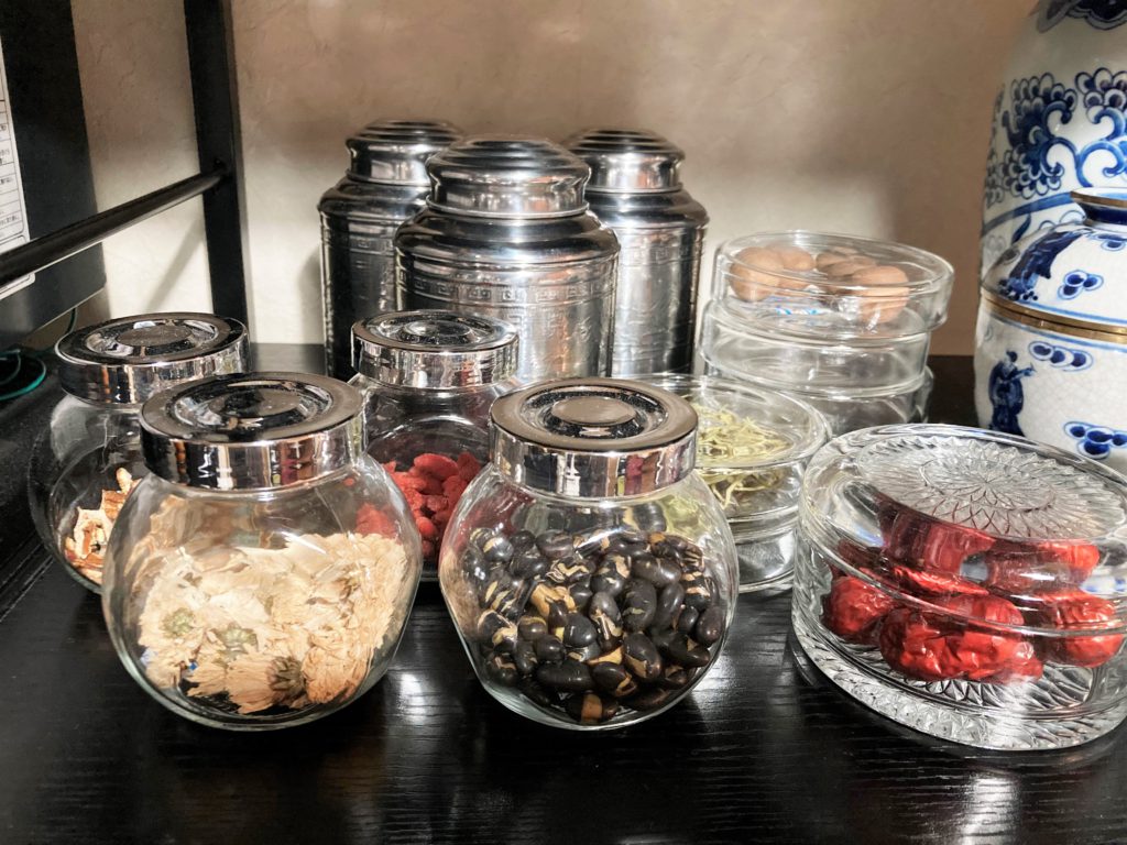 「親戚が鍼の先生だったことや、祖母が一時期中国に住んでいたことなどもあり、昔から東洋医学が身近にありました。そういった影響もあり、以前から漢方には興味があり、ついには薬膳・漢方検定の資格を取得。もちろん自宅には多数常備しています。横浜の中華街にお気に入りのお店が数件あるんですが、業務スーパーや以前通っていた漢方の学校でも購入しています。お茶は普段飲むものから民間薬的なものまで20種類ほど、そして食薬として使えるものはシーズンや効能によって変えていますが、今は喉や目の疲れ、便秘や乾燥などの予防に、クコやナツメの他に、菊花や金銀花(すいかずら)、黒豆、竜眼(りゅうがん)、陳皮(ちんぴ)を常備しています。最近のヒットは桃の花のお茶で、便秘の方にお勧めです。漢方だけでなく、漢茶マスターというお茶の資格も取得したんですが、今後は中国で取れるお茶の国家資格を狙っています」