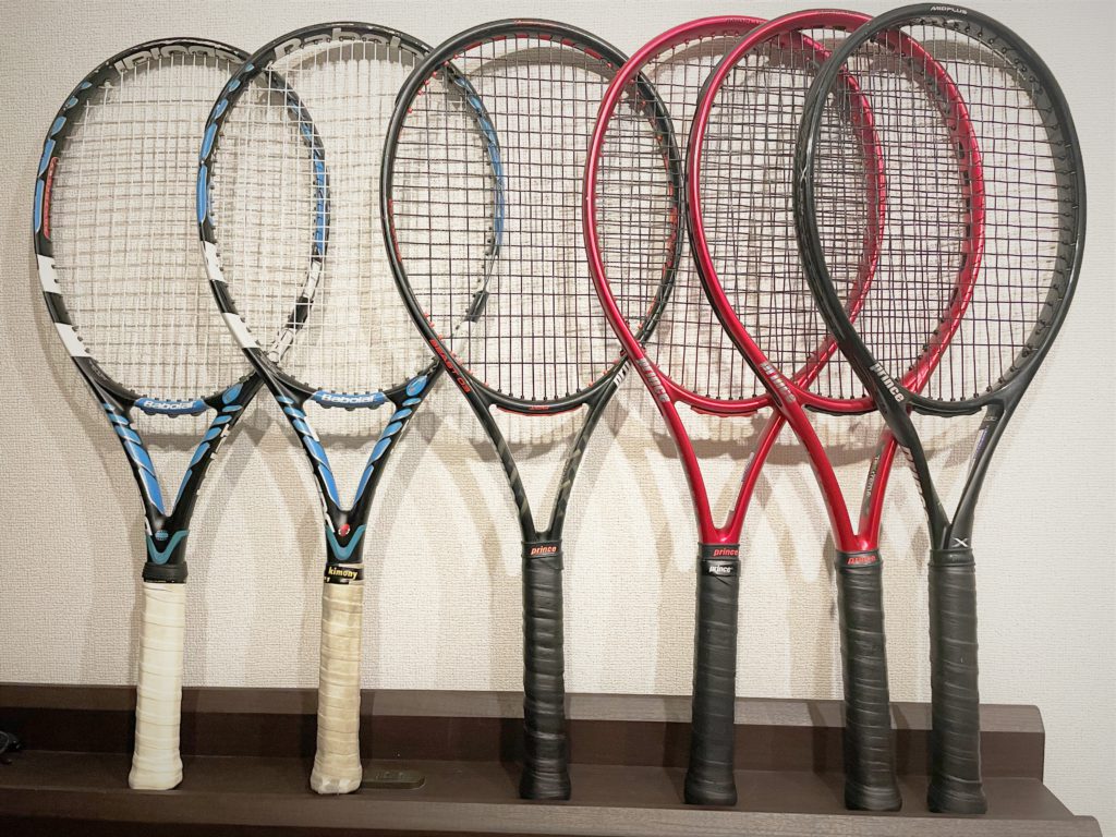 「テニスは小学生の時に始め、まだ現役なのでテニス歴はおよそ20年です。最近使用しているラケットは、この6本。左2本がBabolat(バボラット)で、右4本がPrince(プリンス)です。中でもお気に入りはプリンスのX100TOUR(1番右)というシリーズで、持ち手がその名の通りXのように捻じれてるのが特徴です。捻じれはフォアハンドとバックハンドの両側面で程よいしなりを生み出し、最高な打感を生み出してくれます。実は、弟がプリンスの営業をしているので、彼のおさがりをよくいただいてます(笑)」