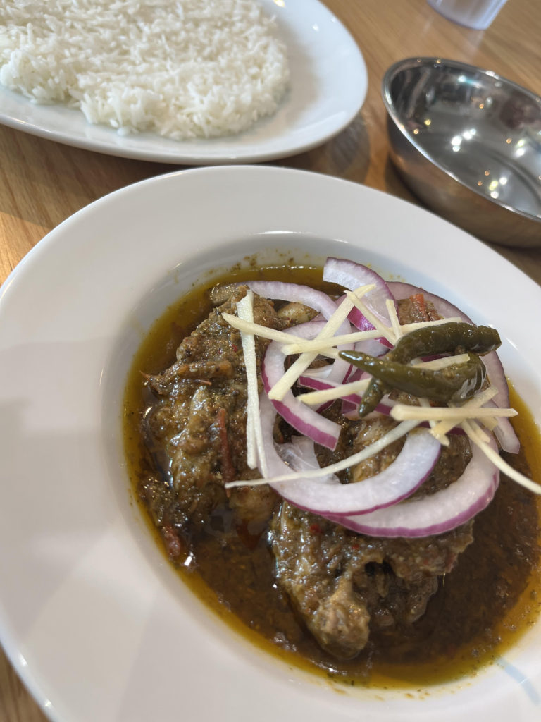 「もともと友人が夫婦で始めたカレー屋さんで、オープンしてすぐ人気に火が付き、今では県外からもカレーファンが訪れる熊本の人気店に。毎日開店前に列が出来ています。営業時間内でもルーが完売すると閉店するので、早めに行くのがおススメ。私もふらっと仕事帰りに行き、入れなかったこともあります(笑)。以前はカレーの種類も多く、華やかなあいがけのカレーなどもありましたが、今は店主のこだわりが詰まったパキスタン料理をアレンジした丸鳥のチキンカレーのみ! これが、肉のうまみが強く、スパイスが効いている。写真だと油っぽく見えますが、無添加・無化調の丸鳥なので重くなく、むしろサラッと食べられます。骨付き肉は豪快に手掴み! ルーや肉から出た油は、ご飯に入れて残さず食べるのもポイントです。店内も、カウンター上にいろいろな雑貨が並べてあり、訪れるだけで楽しい気分になります」