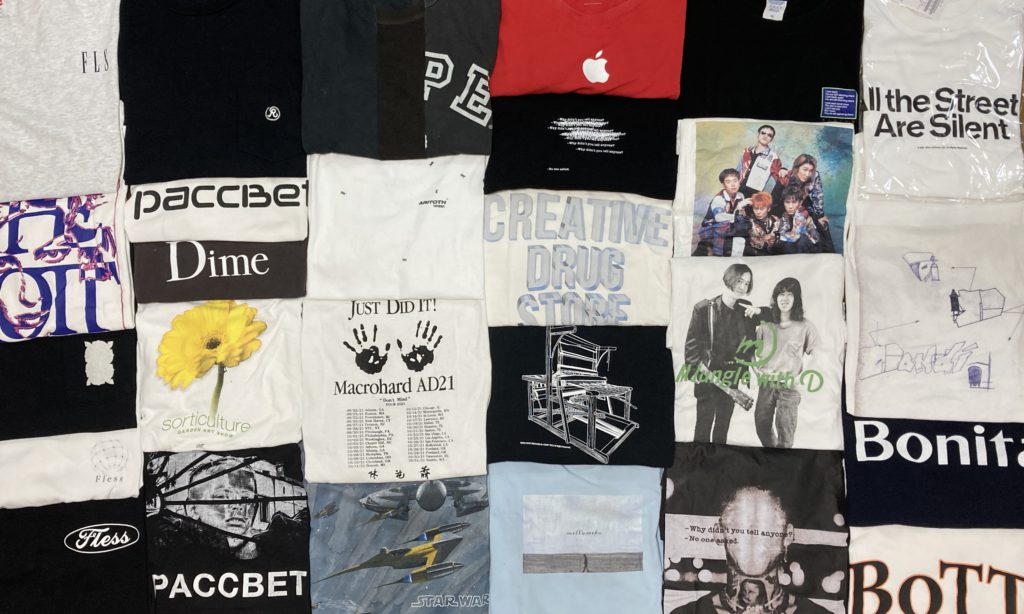 「自作のもの、友達と作ったもの、好きなアーティストのもの、古着屋で買ったものなど、色んなTシャツがあります。特別詳しくはないのですが、ナイスなプリント、フォント、サンプリングのものを見つけたら冬でも買ってしまいます。自分の趣味嗜好を悟られたくないので、わかりやすいデザインのものはあまり着ないです。それでも気づいてくれた人とは仲良くなりたいです(笑)。1万円以上のTシャツは買わない、観たことない映画、聴かないアーティストのTシャツは着ない事が自分ルールです。Tシャツが着たいから観た映画もあります(笑)。」