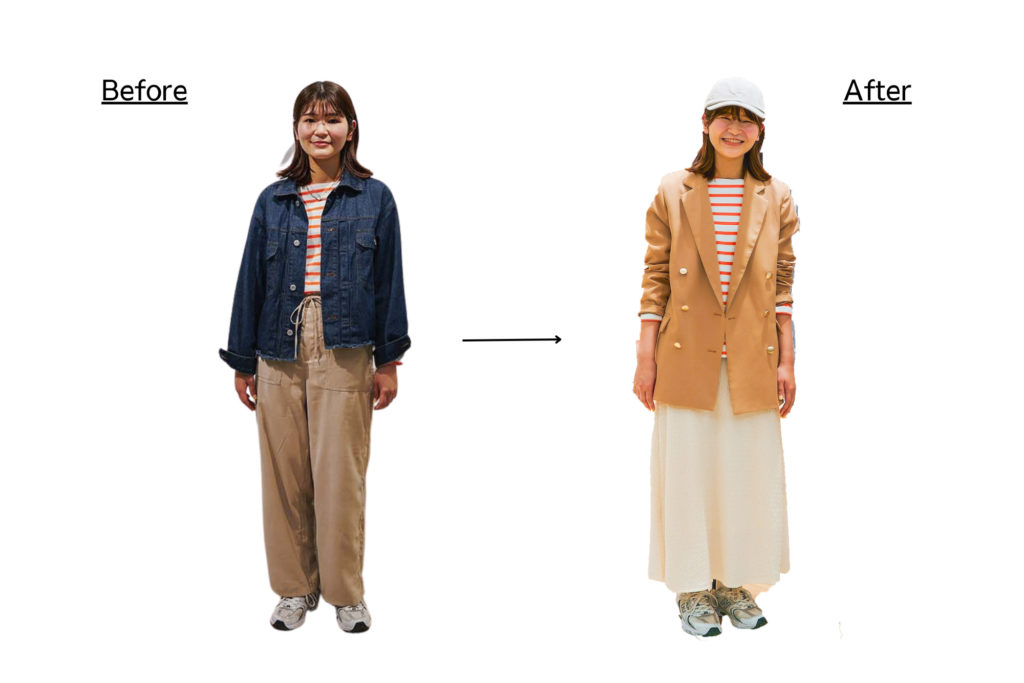 続いて変身するのは、ドレッサーの五反田さん。Beforeのコーディネートでは、鮮やかなオレンジボーダーのトップスを差し色に、インディゴカラーのデニムジャケットを羽織ることで春らしさをプラスしたそう。