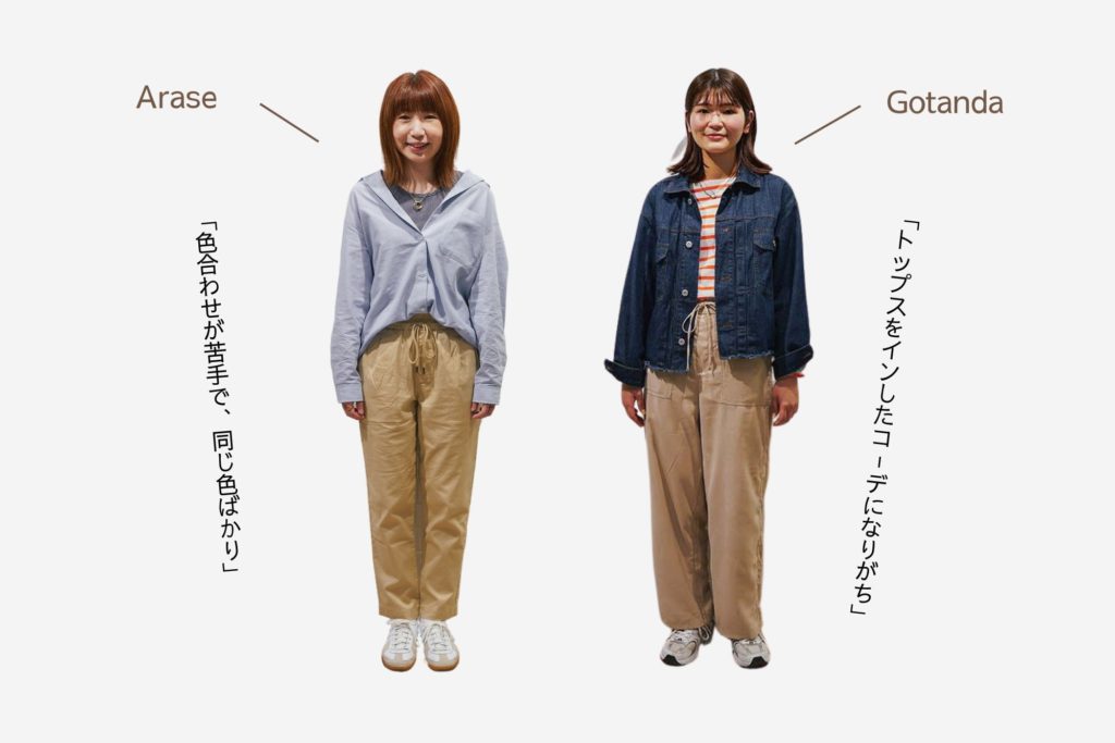 カジュアルスタイルが似合う五反田さんですが、骨格診断の結果が「骨格ウェーブ」だったことから、店舗でもプライベートでもトップスをインしてしまう癖が抜けないのがお悩み。年配のお客さまには「若いからできるのよ」と言われてしまうため、お勧めしにくくなっているそう。今回は、インせずに着こなせる大人なカジュアルコーデに挑戦します!