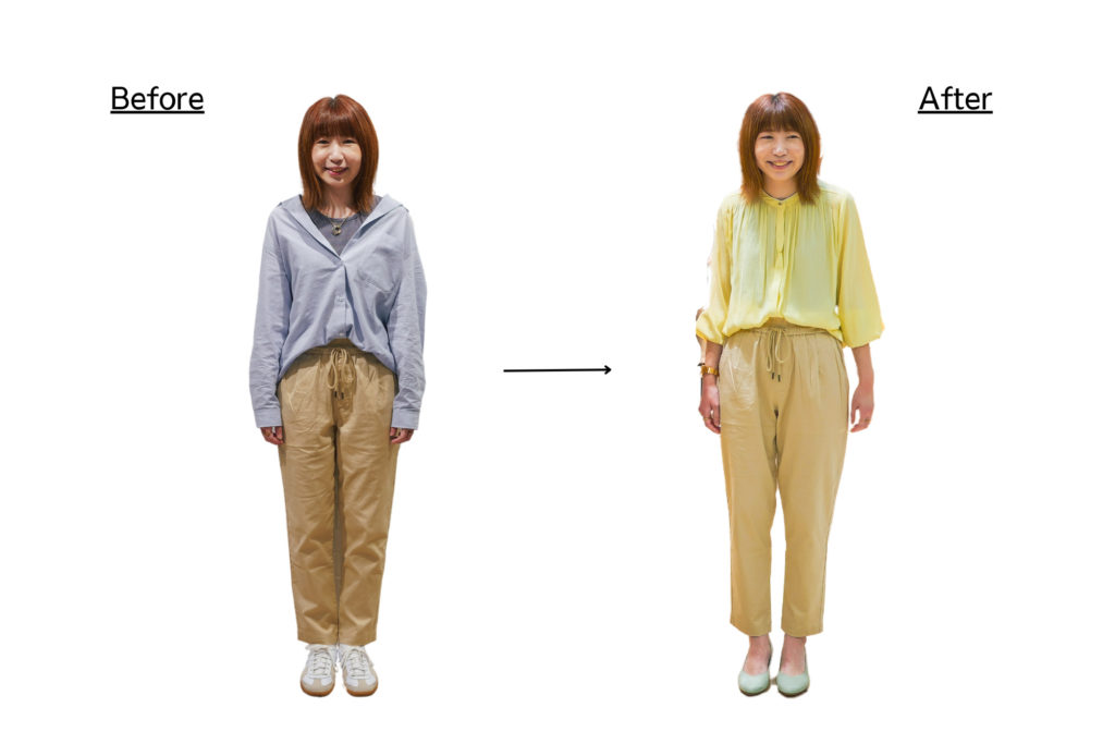荒瀬さんのBefore&After「気軽に色ものコーデができるようになりたい!」