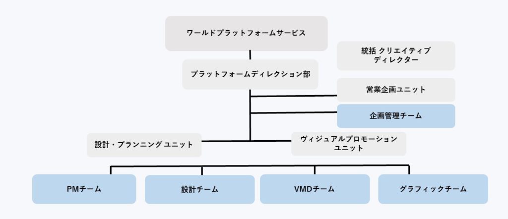プラットフォームディレクション部は、営業企画、設計・プランニング、ヴィジュアルプロモーションの3ユニットで構成しているクリエイティブ(空間創造)部門です。