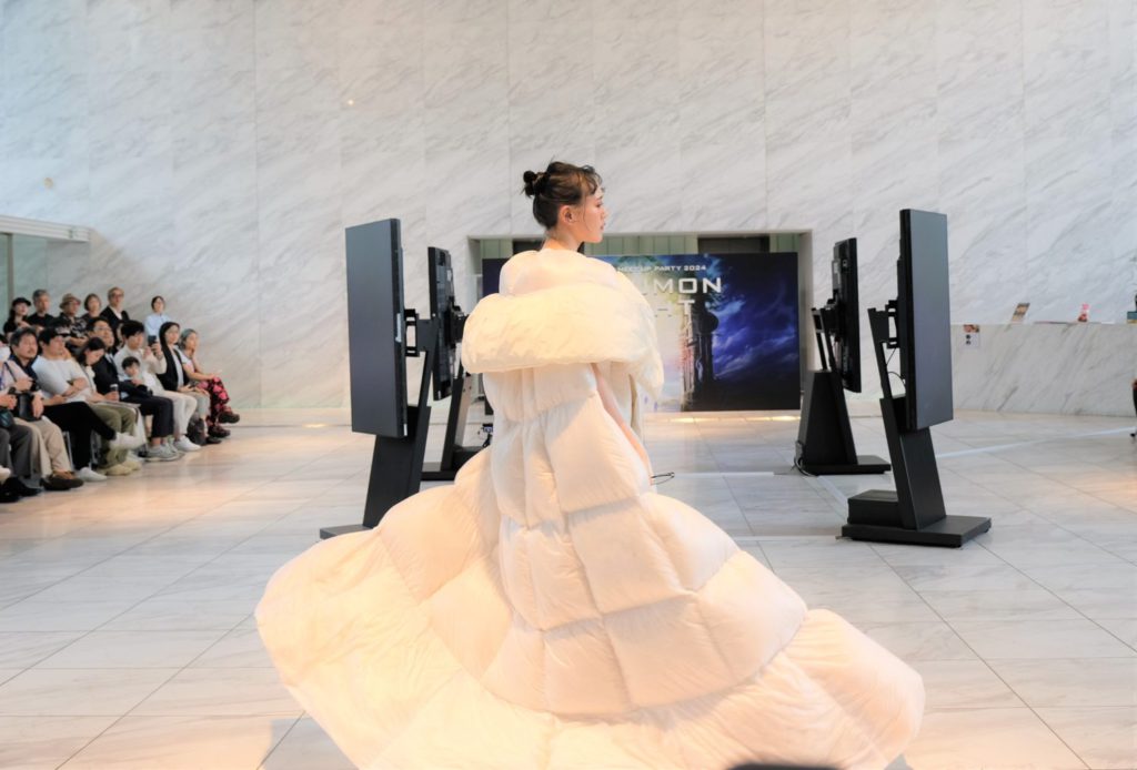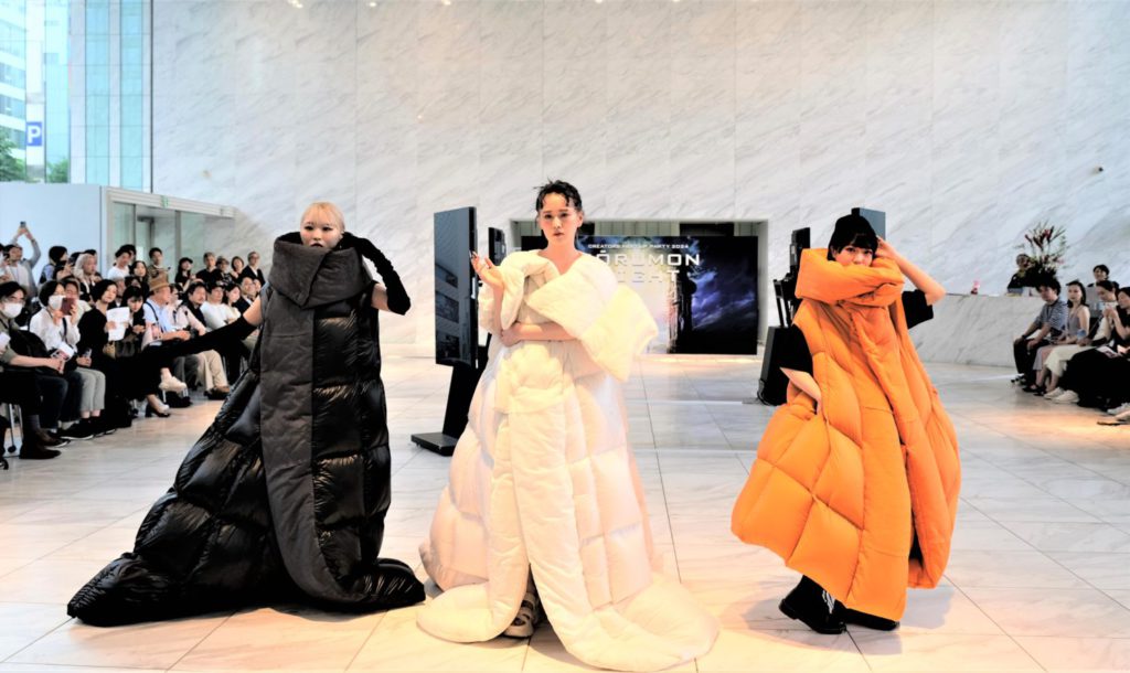 【トヨタ紡織】カケラノダウン/カフツナグフク 工場のごみ箱からランウェイへ。「自動車のシート生産時に廃棄されていた素材」に着目し、裁断端材の欠片を詰め込んだ「カケラノダウン」と自動車シートカバーをつないでできた「カフツナグフク」。