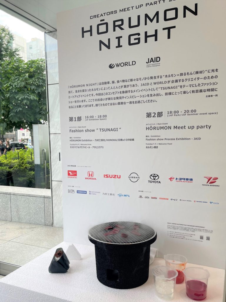 「HŌRUMON NIGHT」は自動車、服、そして食べ物など様々なモノから発生する“ホルモン=放るもん(廃材)”に光を当て、生まれ変わったホルモンによって人と人をつなぐ、JAIDとワールドが企画するミートアップパーティーです。