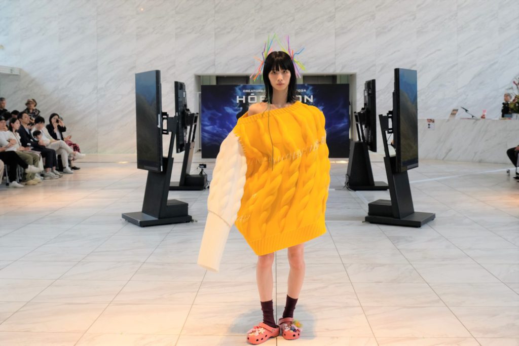 今回このコンセプトを象徴するメインイベントとして開催したファッションショーは、たとえば自動車の生産や廃車時に出てしまうシートやエアバッグを活用して仕立てたデザインのほか、ワールドグループのユーズドセレクトショップ「ラグタグ」の倉庫からピックアップした服をアップサイクルで仕立てるなど、資材の特性も活かした既成概念にとらわれない作品が登場しました。