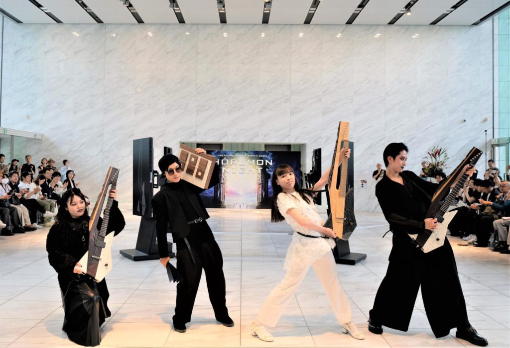 【TOYOTA】TOYOTAカルテット 「車の製造過程で捨てられる樹脂」と「木材の端材や皮の部分」を使って楽器を作りました。捨てられるはずの衣類を身にまとった4人で異素材のコンビネーションを提案。