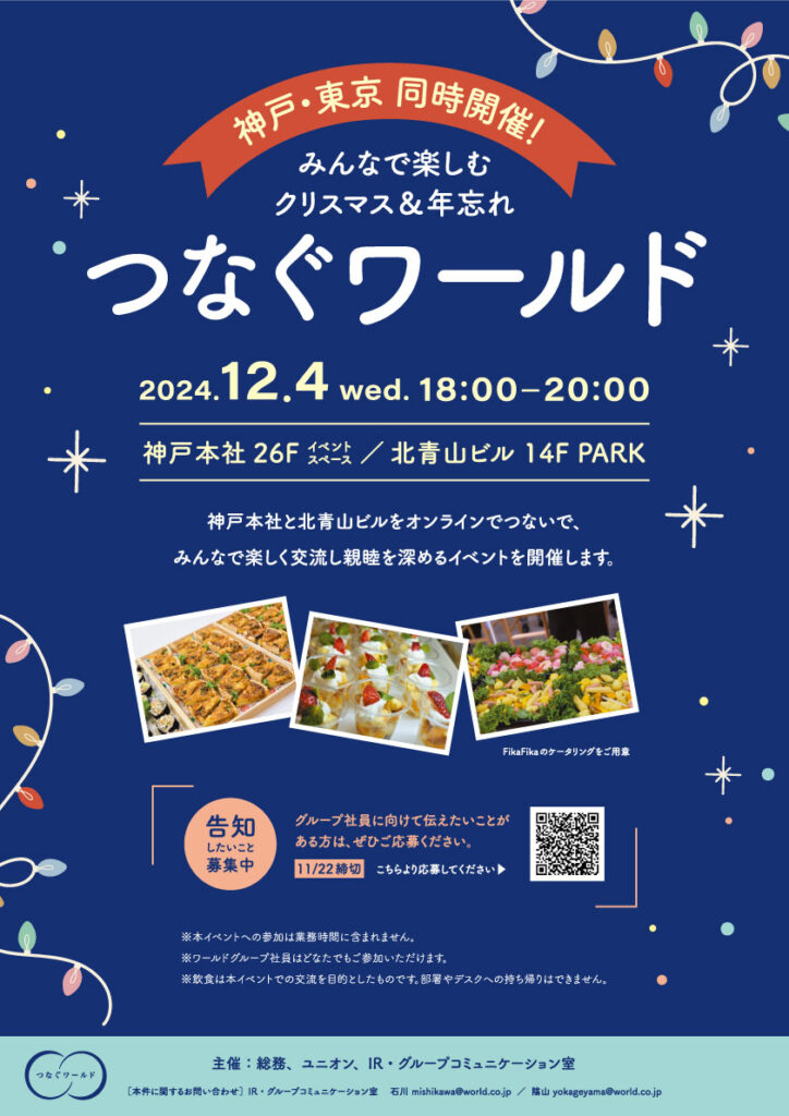 12月4日(水)、神戸本社と北青山ビルをオンラインでつなぎ、グループ社員同士が交流し親睦を深める東西同時開催の「つなぐワールド」を開催します。