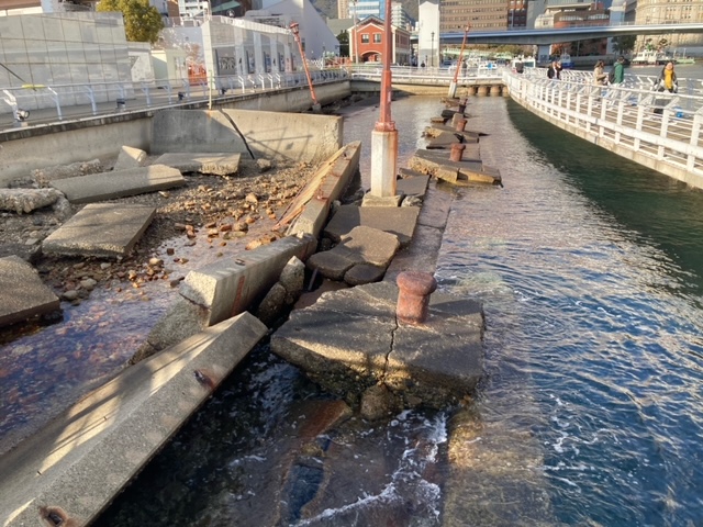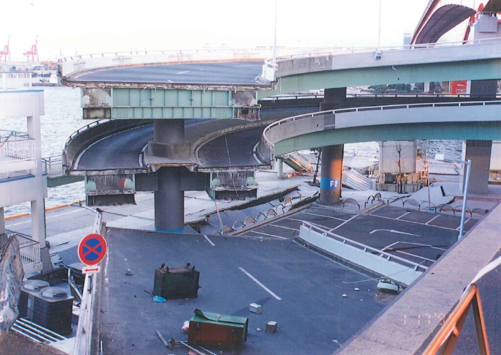 揺れが一旦落ち着いた後、外に出ると、周囲の建物が倒壊していないことへの安心感を得たものの、遠くでは煙が立ち上っていました。その後、会社まで徒歩10分程度でしたので、出社するためにマンションの階段を降り歩き出すと、ポートアイランドは液状化で水びたしになっており、亀裂や陥没がありました。