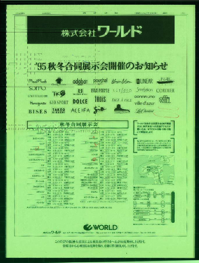 震災時に私が一番記憶に残っているのは、大阪南港で行われた合同展示会です。神戸店では展示会を開催できない状況だったため、3月に大阪南港のATC(イベント・複合型大型モール )で展示会を実施することになりました。この展示会には、ワールドのすべての卸ブランドが集まり、スタッフも神戸店、東京店、本部のメンバーを含めて総動員。皆が一丸となって取り組んだ結果、とても活気に満ちた展示会となりました。まさに「ワン ワールド」と言える瞬間でした。