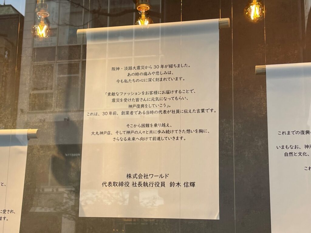◆2月2日(日)まで大丸神戸店ウィンドウ「震災30年展示」に鈴木社長のメッセージが掲示されています。