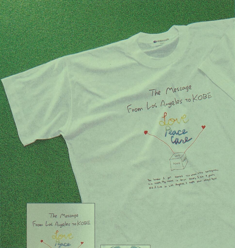同じ震災体験を持つ、ロサンゼルスの子どもたちから神戸の子どもたちに届いた「Love Peace Care」のメッセージと絵柄をワールドがTシャツに。Tシャツは同デザインの絵葉書と復興の息吹を託した花の種とともに、春の選抜高校野球に出場した地元兵庫県の報徳学園、神港学園、育英高校の全生徒にも配布されました。この「Love Peace Care」は東日本大震災のチャリティーTシャツのメッセージにも使われることになります。